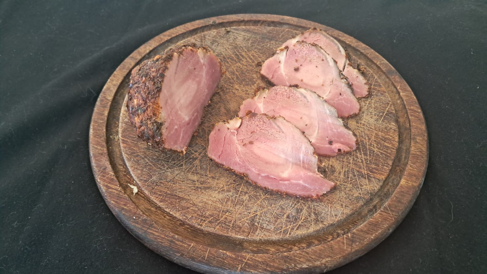 Solomillo de Cerdo (lomito), curado líquido, macerado con especias variadas y cocido en ahumador artesanal a temperaturas moderadas y tiempos prolongados. Presentación en mitades envasadas al vacío.