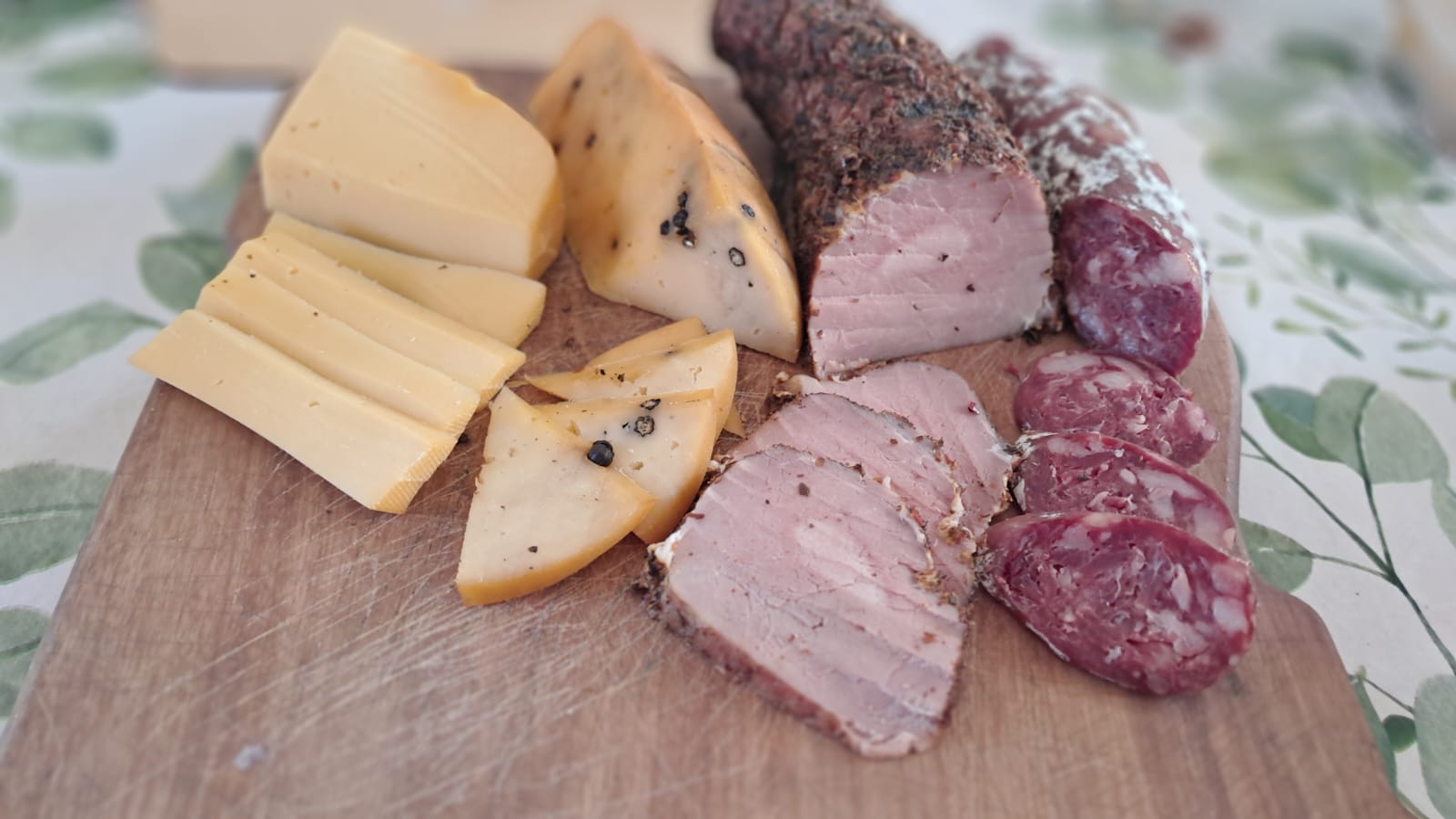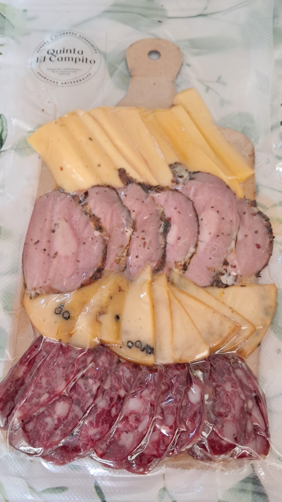 Queso sardo ahumado, Solomillo Casero ahumado, Queso Pepato fresco ahumado y Salamín de campo ahumados. Envasada al vacío. Aproximadamente 800 gramos.