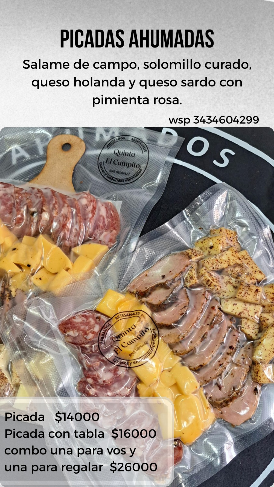 Todos los productos AHUMADOS Envasados al vacío. Aproximadamente 800 gramos. Una picada para vos y una tbla para regalar
